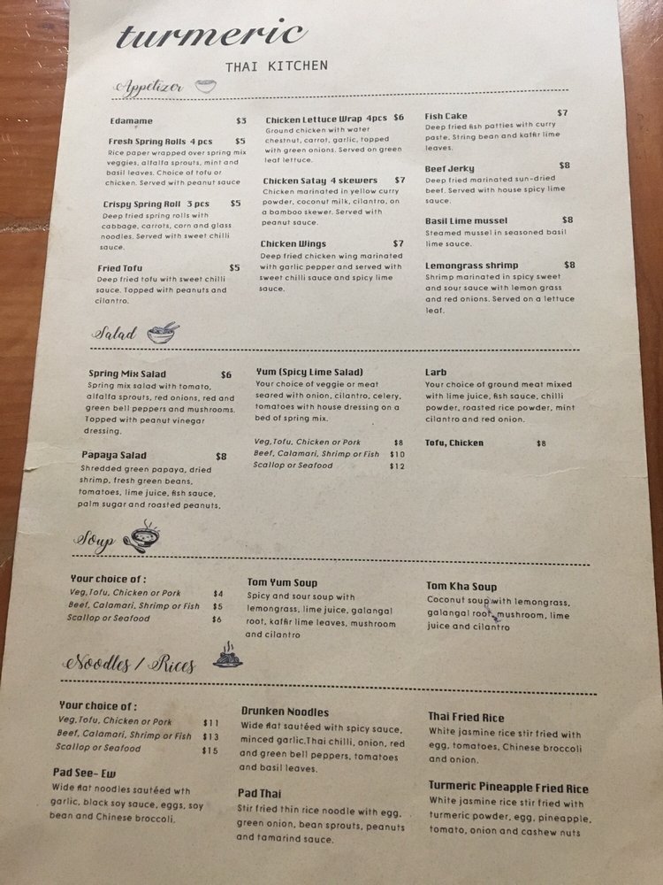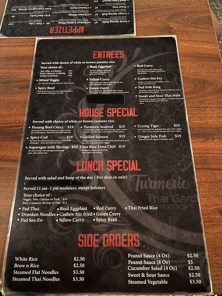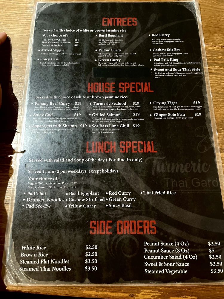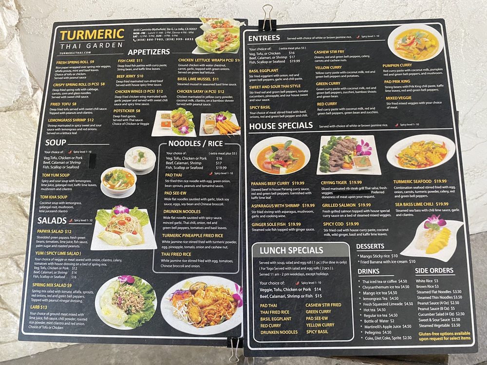 Introducing the menu at Turmeric Thai Kitchen offers a wide range of delicacies for both meat lovers and vegetarians alike. From appetizers like Fresh Spring Rolls and Crispy Spring Rolls to soups like Tom Yum Soup and Tom Kha Soup, the menu is filled with flavorful options. Don't miss out on their signature salads like the Papaya Salad or Yum Salad for a burst of refreshing flavors. Customers have raved about their Green Curry and Salmon entrees, highlighting the delicious house curry sauce. With cozy ambiance, friendly service, and the option of outdoor seating, Turmeric Thai Kitchen is the perfect spot for a relaxing and satisfying meal in La Jolla.