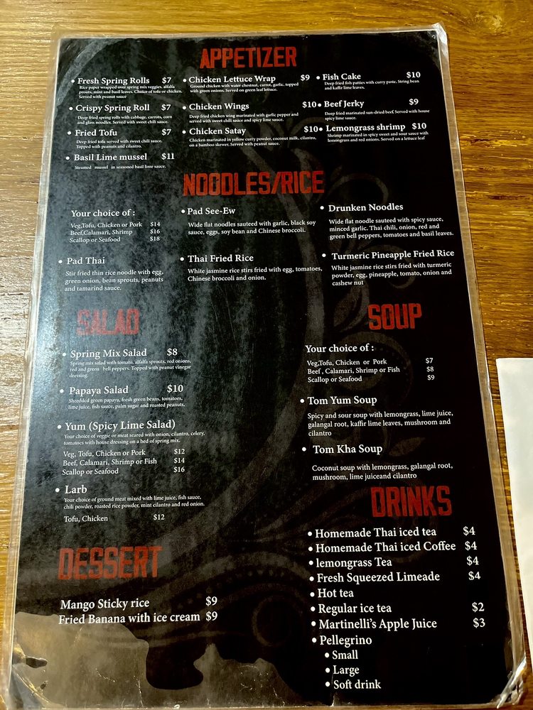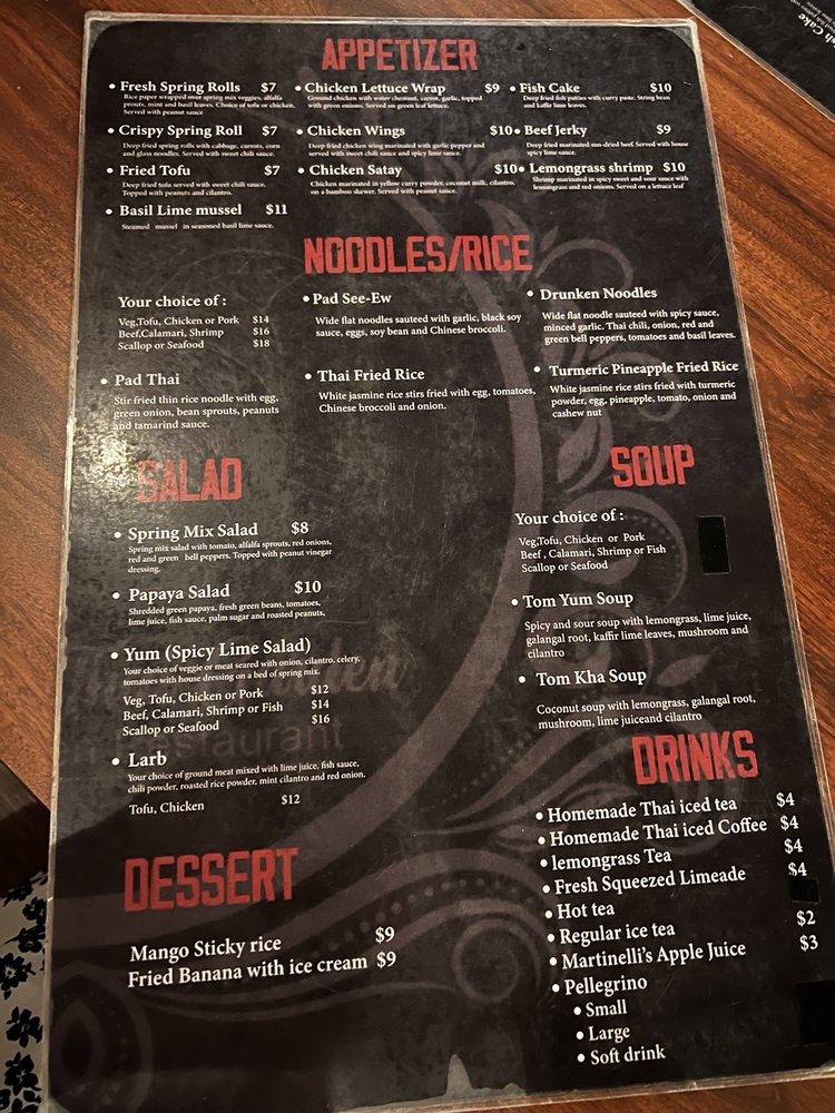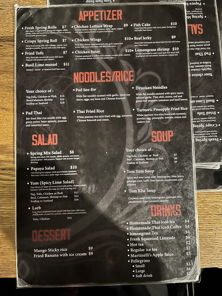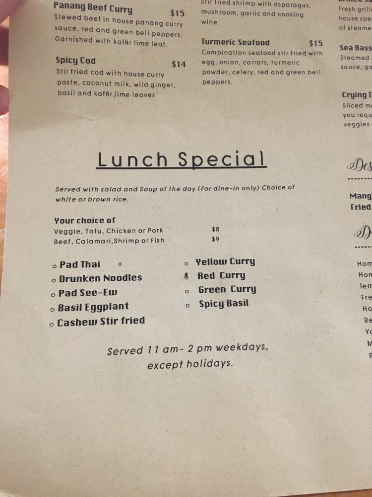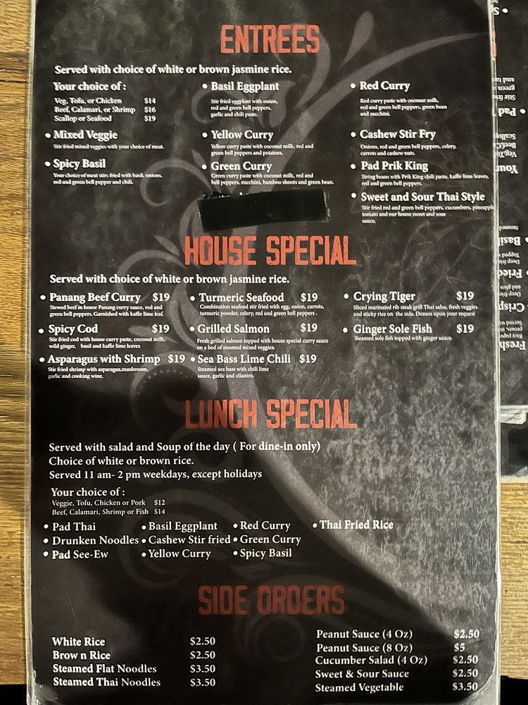 Introducing the menu at Turmeric Thai Kitchen offers a wide range of delicacies for both meat lovers and vegetarians alike. From appetizers like Fresh Spring Rolls and Crispy Spring Rolls to soups like Tom Yum Soup and Tom Kha Soup, the menu is filled with flavorful options. Don't miss out on their signature salads like the Papaya Salad or Yum Salad for a burst of refreshing flavors. Customers have raved about their Green Curry and Salmon entrees, highlighting the delicious house curry sauce. With cozy ambiance, friendly service, and the option of outdoor seating, Turmeric Thai Kitchen is the perfect spot for a relaxing and satisfying meal in La Jolla.